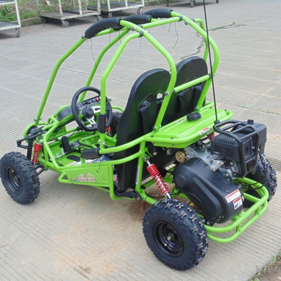 det er en dobbelt sete, full fjæring gå Kart utstyrt med 163cc, 5.5hp motoren elektrisk start med trekk starter tilbake opp og funksjoner 2-hjulet stasjonen og sentrifugal clutch, enkel kontroll med stopp / gå foten pedalene.